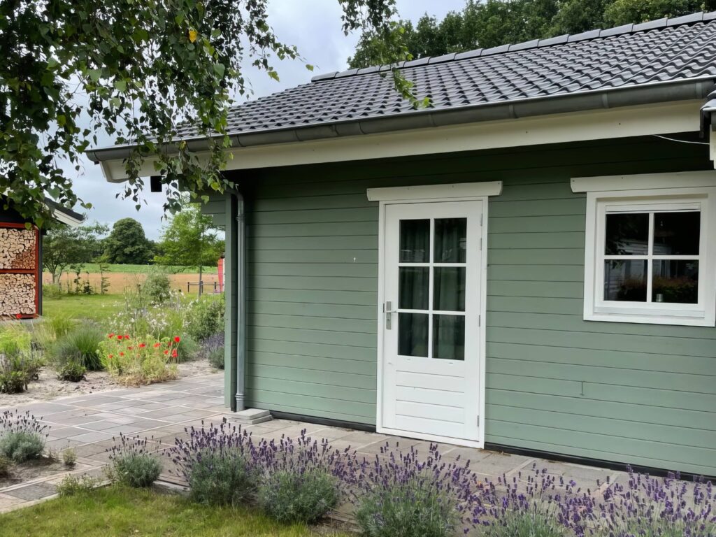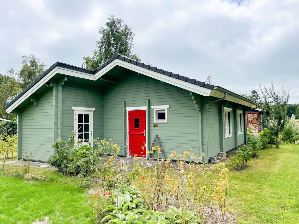 Wij kozen voor de kleur Parkgroen, een heel natuurlijke en frisse kleur. We krijgen veel complimenten over onze blokhut en de kleur!”