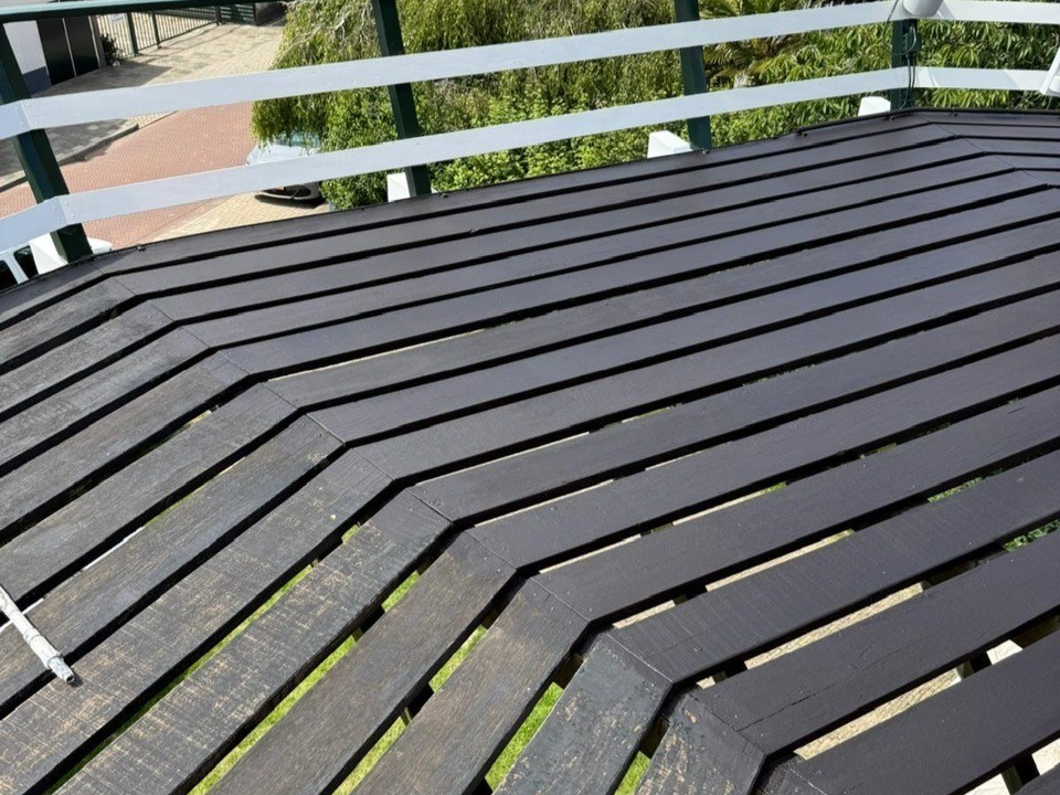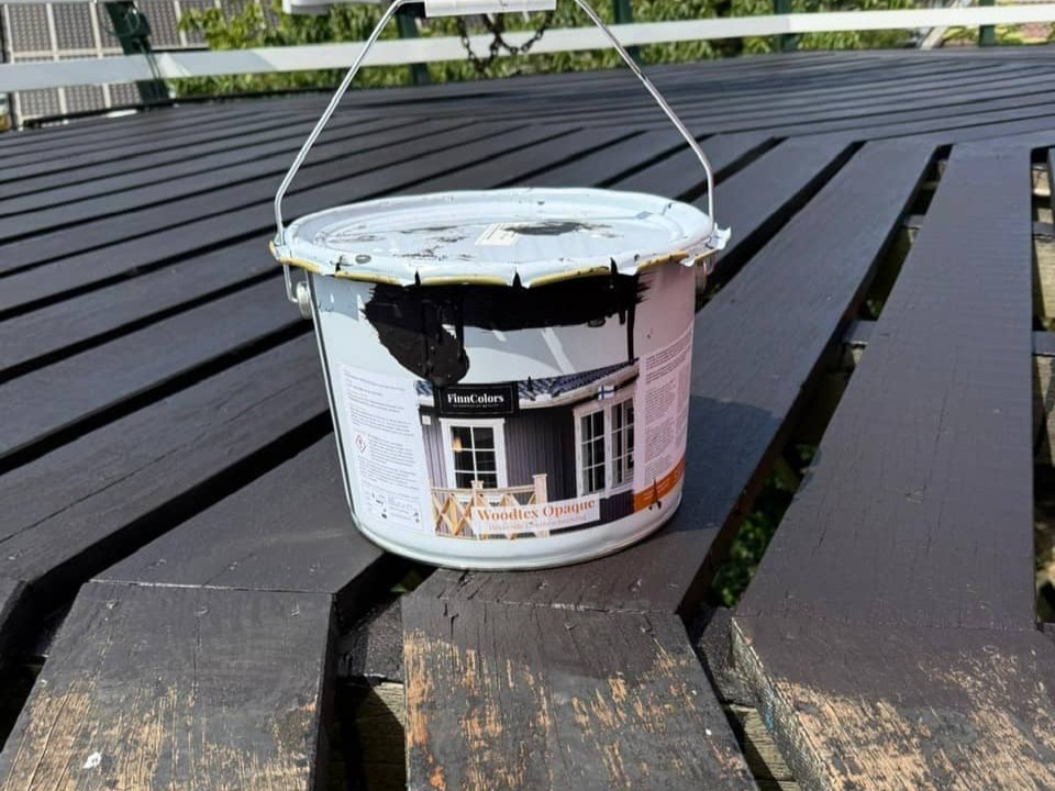 Schilder Gerco Vlieland uit Katwijk was samen met zijn zoon verantwoordelijk voor deze klus. “We hebben eerst de oude verf met een hogedrukspuit gereinigd en verwijderd, daarna hebben we het afgeschuurd. Voordeel van deze Finse beits is dat het minder snel bladdert en de houtnerf blijft mooi zichtbaar. De beits verwerkt erg prettig”