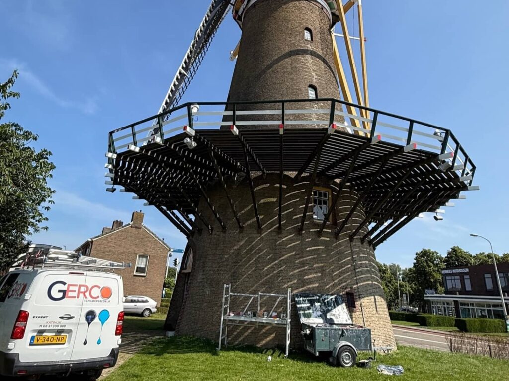 Begin juni leverden wij dekkende beits in de kleur RAL 8022 voor de renovatie van molen ‘De Geregtigheid’ in Katwijk aan Zee. Een prachtig project van een molen uit het jaar 1740!