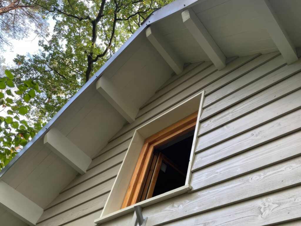 Omdat we een leeftijd hebben bereikt waarop we zo weinig mogelijk onderhoud willen plegen, was dit ook een belangrijk criterium bij onze keuze voor FinnColors. Uiteindelijk kozen we voor de kleur ’Linnen’ op de wanden en de kleur ’Koraal’ op de dakoverschotten. We krijgen zeer veel positieve reacties, zowel over de kleur maar ook over de houtstructuur die zichtbaar blijft.