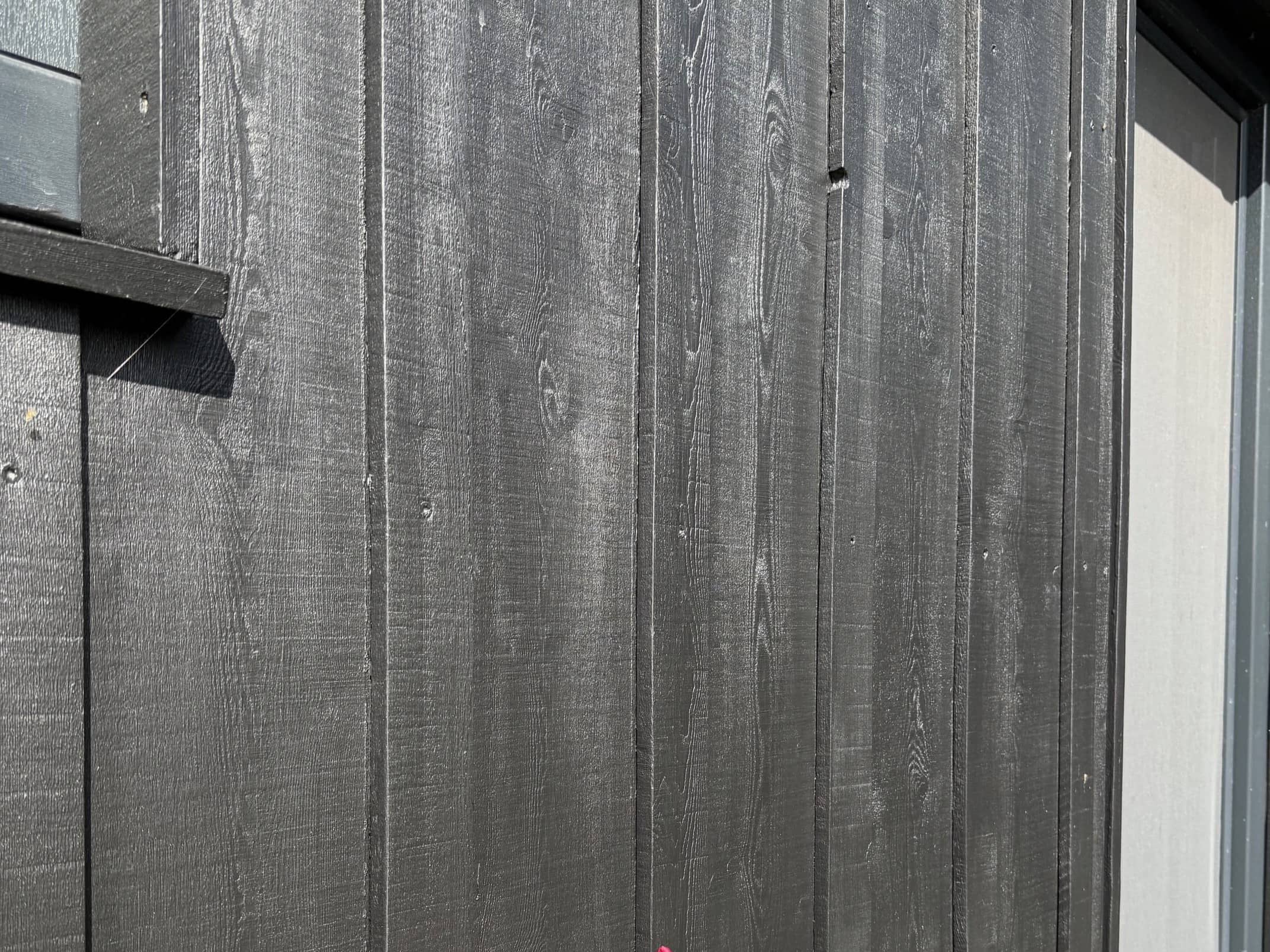 Het mooiste van deze Finse beits is het gemak van het verven; het is zo ontzettend makkelijk om aan te brengen. Daarnaast blijf je de houtnerf zien, precies wat we wilden: een zo natuurlijk mogelijke uitstraling. De 1e laag hebben we in de werkplaats op losse planken aangebracht. Vervolgen hebben we de planken na het aanbrengen een periode uit laten werken om vervolgens de 2e laag aan te brengen.